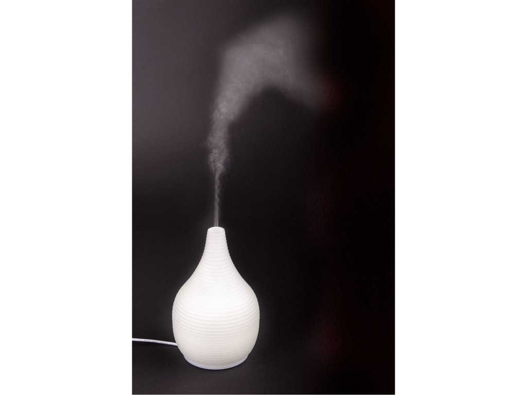 Zvlhčovač vzduchu s difuzérem vyrobený z mléčného skla. Aromatizuje a zvlhčuje vzduch kombinací účinků vodní mlhy a esenciálních olejů. Pomocí jemného ultrasonického vlnění rozkládá esenciální oleje na extrémně malé mikročástice, aniž by je zahříval. Oleje si tak zachovávají původní vůni i léčivé účinky. Aroma difuzér vám pomůže vytvořit z každého pokoje vonící oázu a navodit relaxační atmosféru. Bez přidání esenciálního oleje vám aroma difuzér poslouží jako zvlhčovač vzduchu. Přidáním konkrétního esenciálního oleje můžete sobě, nebo vašim blízkým pomoci s různými obtížemi. Postačí pár kapek kvalitního oleje a můžete ulevit rýmě, kašli, bolestem hlavy, nebo špatnému usínání. Správně zvolený olej vyčistí vzduch, nebo vám jednoduše zpříjemní pobyt v místnosti, ve které se právě nacházíte. Díky neutrálnímu designu z mléčného skla stylově doplní vybavení všech obytných prostor, dětských pokojů, jednacích místností, masážních salónů, wellness center apod. Vhodně zvolenými esenciálními oleji můžete podpořit relaxační atmosféru v ložnici, dezinfekci vzduchu či klidný spánek v dětském pokoji. Koncentraci v pokoji studenta anebo uvolněnou komunikaci, ať už doma nebo v pracovním prostředí. Používejte vždy kvalitní oleje. Použitím levných, umělých olejů sice vytvoříte voňavé prostředí, ale tělo a mysl si neodpočinou. Citlivým osobám může naopak uškodit. Například bolestí hlavy apod. Během provozu aroma difuzéru lze libovolně a jednoduše nastavit světelné efekty, které vytvoří ve vašem pokoji velmi příjemné prostředí a navodí relaxační atmosféru. Aroma difuzér je vhodný všude, kde je z bezpečnostních důvodů nemožné použít otevřený oheň (svíčky v aroma lampách). Kombinuje účinky vodní mlhy a esenciálních olejů. Obsluha aroma difuzéru je velmi jednoduchá. Do zásobníku nalejete vodu, nejlépe destilovanou. Nakapete několik kapek esenciálního oleje a přístroj zapnete stiskem tlačítka. Aroma difuzér začne okamžitě vytvářet vodní mlhu a rozptylovat olej do vzduchu. Dalšími stisky můžete nastavit různé barvy v intenzivnější nebo světlejší verzi, které zůstanou nastaveny během provozu přístroje, dokud je nezměníte. Barevné světlo procházející mléčným sklem vytváří příjemný světelný efekt. Nemusíte kontrolovat množství vody v zásobníku. Po vyprázdnění se aroma difuzér sám vypne.