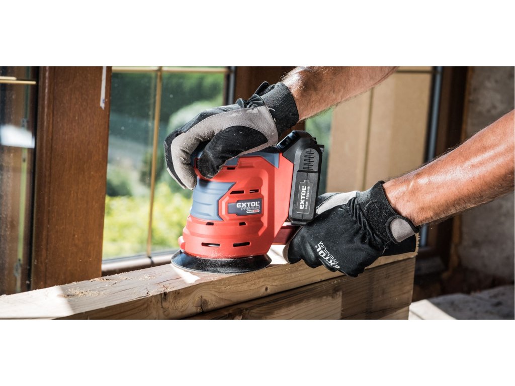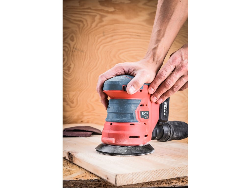 Aku excentrická bruska je ideální nástroj pro broušení dřeva a dřevěných materiálů, kovů a k zabroušení poškozených míst povrchové úpravy, např. barvy a laku, dále tmelů apod. bez použití vody. Rotační pohyb vytváří vysoký brousící výkon a excentricita vytváří náhodný pohyb, který zabraňuje vzniku nežádoucích hlubokých rýh v broušeném materiálu. Brusná plocha je vybavena suchým zipsem, který umožňuje snadnou výměnu brusných papírů. Integrované odsávání pilin udržuje čistý pracovní prostor při práci a po práci jednoduše vysypete sběrný vak a je uklizeno. Pro běžnou práci dostačují jeden nebo dva 2000mAh akumulátory, které můžete rychle nabít v rychlonabíječce, pro náročnější nebo delší práci doporučujeme větší akumulátory s kapacitou 4000–8000mAh. Akumulátor lze použít ve všech typech nářadí řady EXTOL SHARE20V. Díky použité Li-ion technologii je ho možné kdykoliv dobíjet, aniž by se tím snižovala jeho kapacita. Li-ion akumulátor ztrácí energii vlivem samovybíjení velmi pomalu a vydrží dlouho nabitý a připravený k použití.