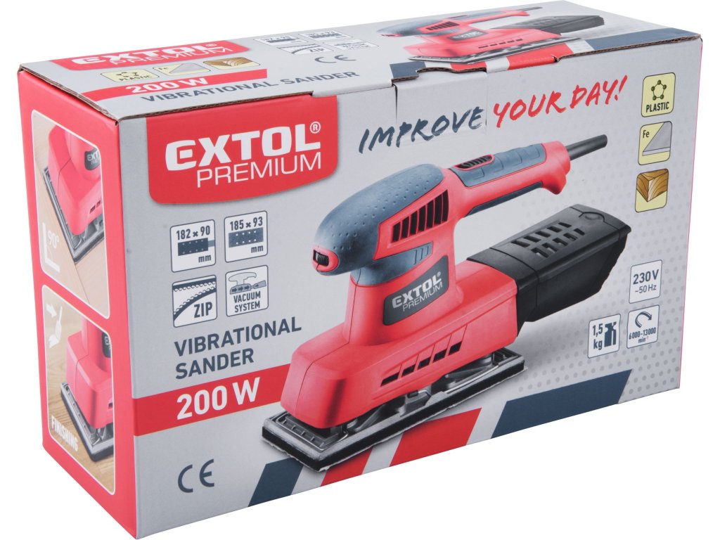 Dvouruční výkonná bruska pro plošné a rohové broušení plochých dřevěných materiálů, kovů, plastů, tmelů a laků. Při broušení si můžete upravit rychlost dle typu broušeného materiálu. Z důvodu delší životnosti má bruska pevnou kovovou základnu na kterou lze přichytit brusné papíry pomocí suchého zipu nebo svorkami. Čistý pracovní prostor zajišťuje integrovaný systém odsávání pilin do sběrného boxu. Horní strana rukojeti je pokryta gumou, která tlumí přenos vibrací při práci. Není vhodná pro broušení sádrokartonu.
