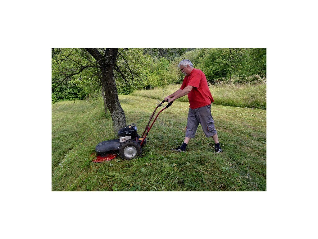 Žací ústrojí: | talíř s otočným podběhem vybavený 2 noži, možnost 4, ochranný rám s vrchní sítí bránící odletu prskajících částic |