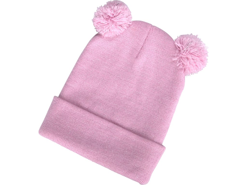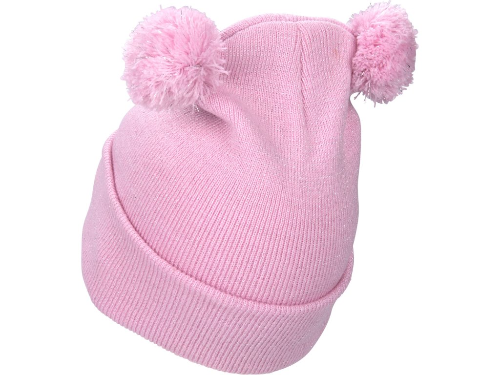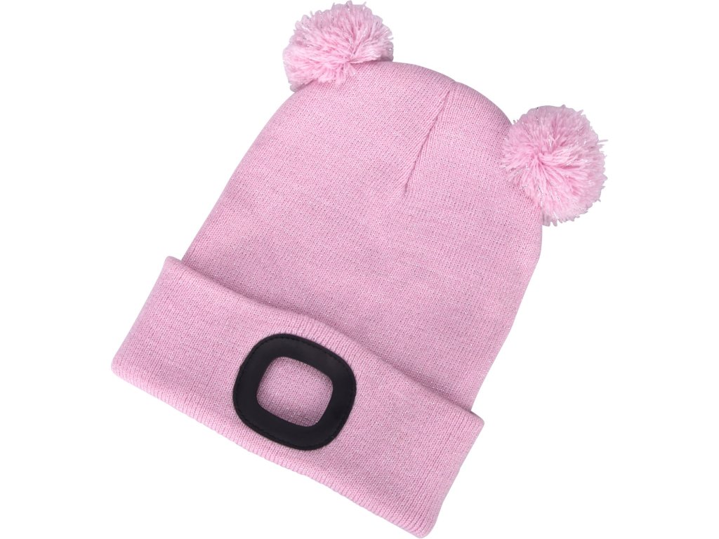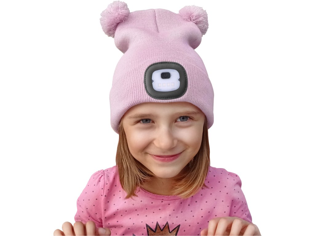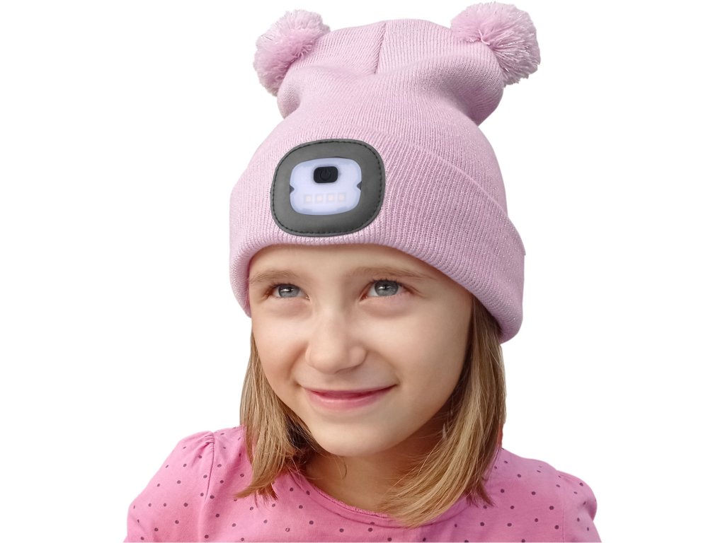Čepice s čelovkou 4x25lm, USB nabíjení, růžová se třpytkou a bambulemi, dětská, 70% acryl a 30% polyester.
