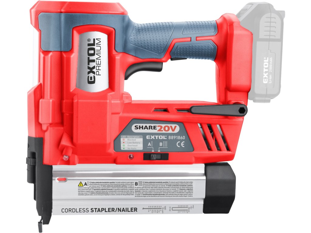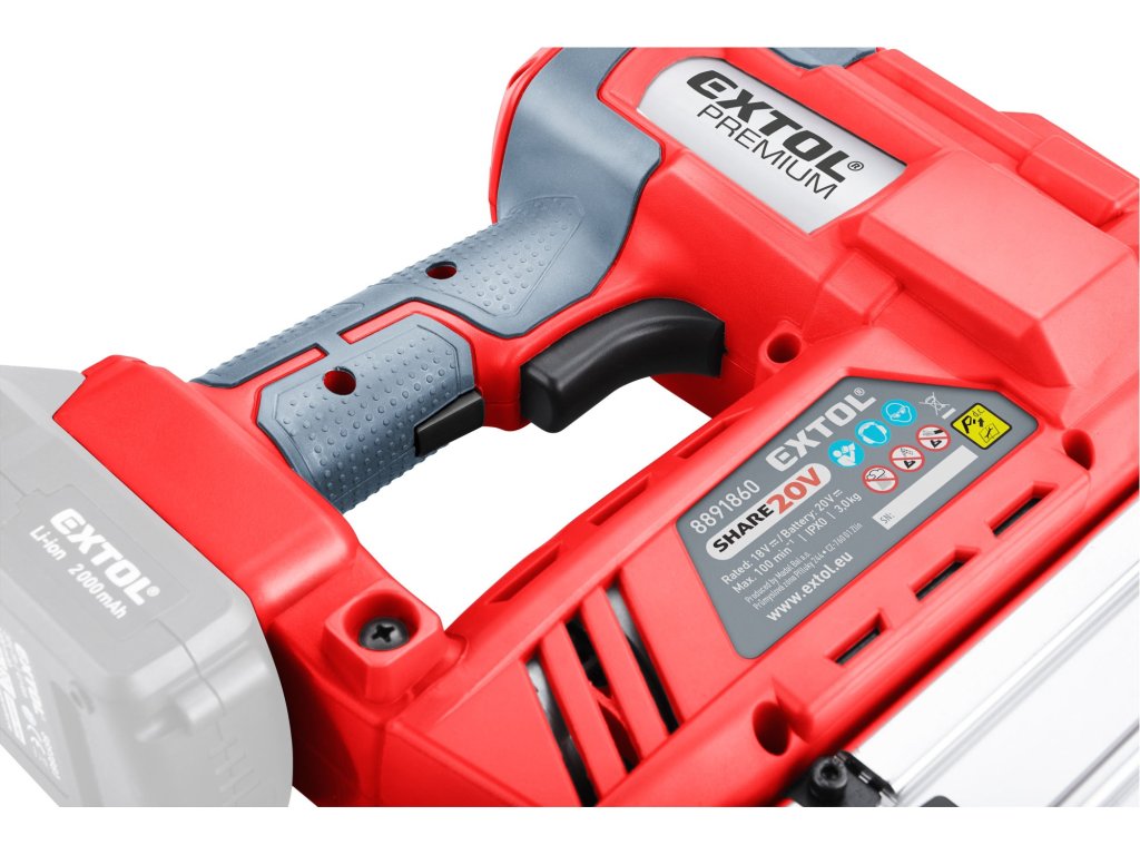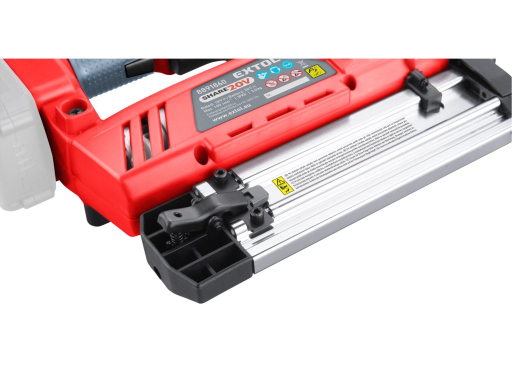 2v1 funkce této 20V aku hřebíkovačky/sponkovačky s ní dělají ideální nástroj pro domácí úpravy, jako jsou truhlářské práce, instalaci lišt obložení, izolace, plastových folií, čalounění a další dokončovací práce. Napájení akumulátorem poskytuje konzistentní a spolehlivý výkon díky silné 20V lithium-iontové baterii a eliminuje potřebu hlasitého a těžkého kompresoru a manipulaci s dlouhou vzduchovou hadici. Hřebíkovačka může vystřelit až 60 hřebíků za minutu. Při práci si můžete zvolit ze dvou režimů: režim jednotlivého odpálení, který se používá pro přesné umístění hřebíků a kontaktní režim, při kterém hřebíkovačka vystřelí při kontaktu s materiálem. Gumová špička chrání materiál, při kontaktu a dvoustupňový spoušť chrání uživatele před náhodným vystřelením. Akumulátor lze použít ve všech typech nářadí řady EXTOL SHARE20V. Díky Li-ion technologii je možné akumulátory kdykoliv dobíjet, aniž by se tím snižovala jejich kapacita. Li-ion akumulátor ztrácí energii vlivem samovybíjení velmi pomalu a vydrží dlouho nabitý a připravený k použití.