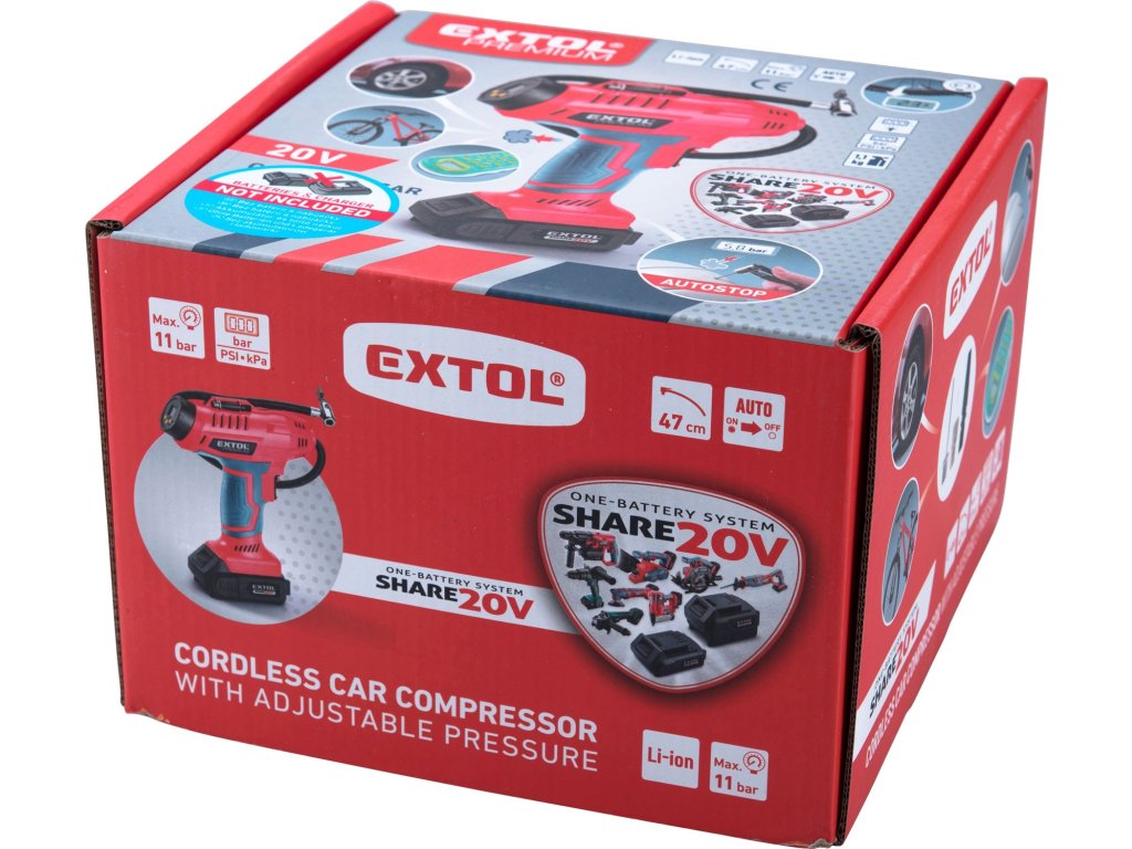 Výkonný a silný plnící aku kompresor, je určen ke kontrole a k doplnění tlaku pneumatik osobních a užitkových automobilů, motorek a cyklistických kol na předepsaný tlak a s dodávaným příslušenstvím také k nafouknutí sportovních míčů, lehátek, matrací apod. Na displeji kompresoru si můžete jednoduše zvolit tlak v bar, psi, kPa a kompresor se automaticky při dosažení této hodnoty zastaví. Pro práci ve tmě je tento displej podsvícený a kompresor má světlo, které svítí i když kompresor není zapnutý. Spínač kompresoru je vybaven pojistkou proti samovolnému spuštění a zámkem, kterým můžete zaaretovat spínač v poloze zapnuto. Samotný kompresor uvnitř stroje má celokovovou konstrukci zajišťující dlouhou životnost. Pro běžnou práci dostačují jeden nebo dva 2000mAh akumulátory, které můžete rychle nabít v rychlonabíječce, pro náročnější nebo delší práci doporučujeme větší akumulátory s kapacitou 4000–8000mAh. Akumulátor má indikátor nabití a lze použít ve všech typech nářadí řady EXTOL SHARE20V. Díky použité Li-ion technologii je ho možné kdykoliv dobíjet, aniž by se tím snižovala jeho kapacita. Li-ion akumulátor ztrácí energii vlivem samovybíjení velmi pomalu a vydrží dlouho nabitý a připravený k použití.