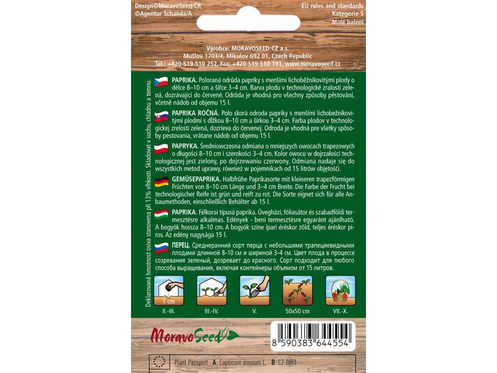Poloraná odrůda papriky s menšími lichoběžníkovitými plody o délce 8 - 10 cm a šířce 3 - 4 cm. Barva plodu v technologické zralosti zelená, dozrávající do červené. Odrůda je vhodná pro všechny způsoby pěstování, včetně nádob od objemu 15 l.