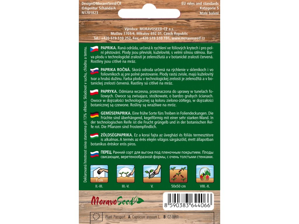 Raná odrůda, určená k rychlení ve fóliových krytech i pro polní pěstování. Plody jsou převislé, kuželovité, s velmi silnou stěnou. Barva plodu v technologické zralosti je zelenožlutá a v botanické zralosti červená. Rostliny jsou citlivé na mráz.