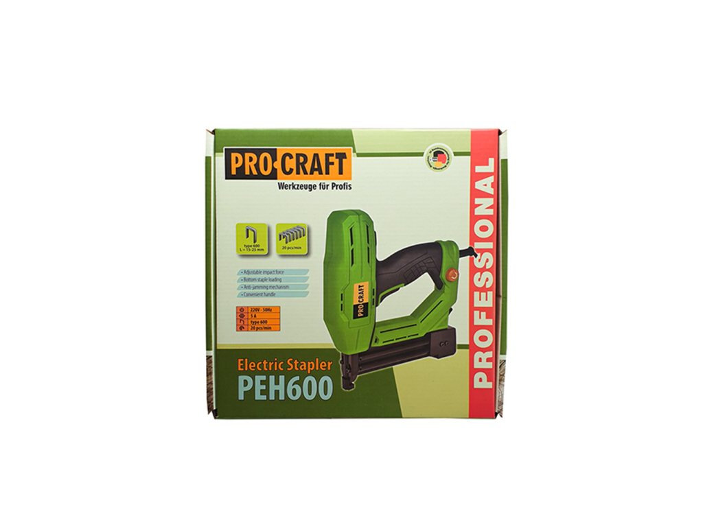 Elektrická sponkovačka Procraft PEH600 je určena k upevňování textilu, fólií, izolačního materiálu na dřevo. Regulace síly úderu umožňuje nastavení optimálních parametrů při práci s různými materiály. Sponkovačka má zásobník na 100sponek s délkou v rozsahu 15-25 a mm a na 100 hřebíků s délkou v rozsahu 15-32mm. Šířka sponek 5,7mm. Součástí dodávky jsou spony a hřebíky.