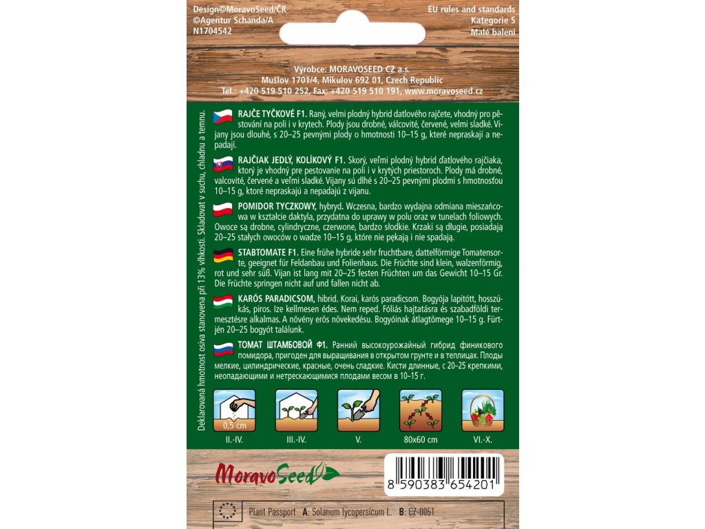 Raný, velmi plodný hybrid datlového rajčete, vhodný pro pěstování na poli i v krytech. Plody jsou drobné, válcovité, červené, velmi sladké. Vijany jsou dlouhé, s 20-25 pevnými plody o hmotnosti 10-15g, které nepraskají a nepadají.