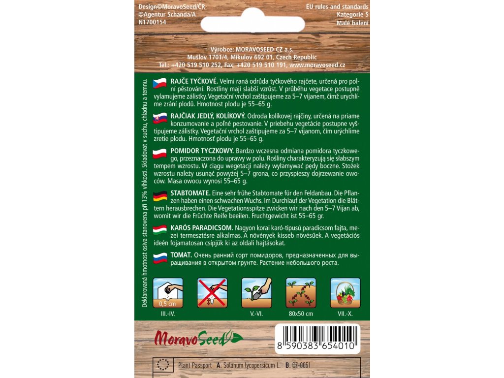 Velmi raná odrůda tyčkového rajčete určená pro polní pěstování. Rostliny mají slabší vzrůst. V průběhu vegetace postupně vylamujeme zálistky. Vegetační vrchol zaštipujeme za 5-7 vijanem, čímž urychlíme zrání plodů. Hmotnost plodu je 55-65 g.