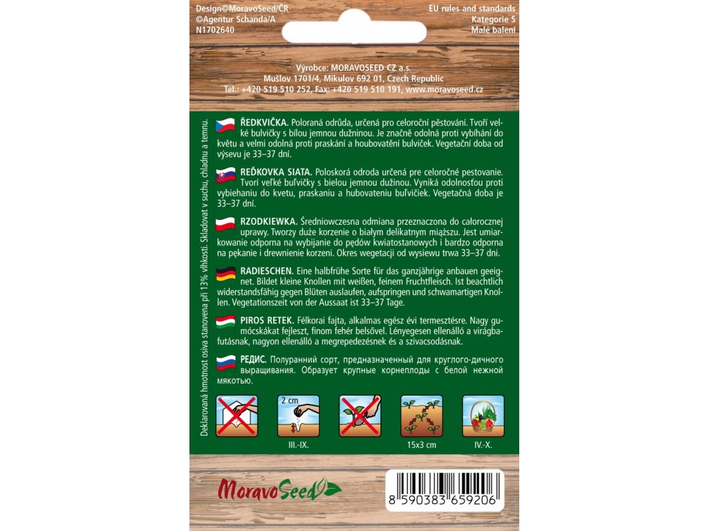 Poloraná odrůda určená pro celoroční pěstování. Tvoří velké bulvičky s bílou jemnou dužninou. Je značně odolná proti vybíhání do květu a velmi odolná proti praskání a houbovatění bulviček. Vegetační doba od výsevu je 33-37 dní.