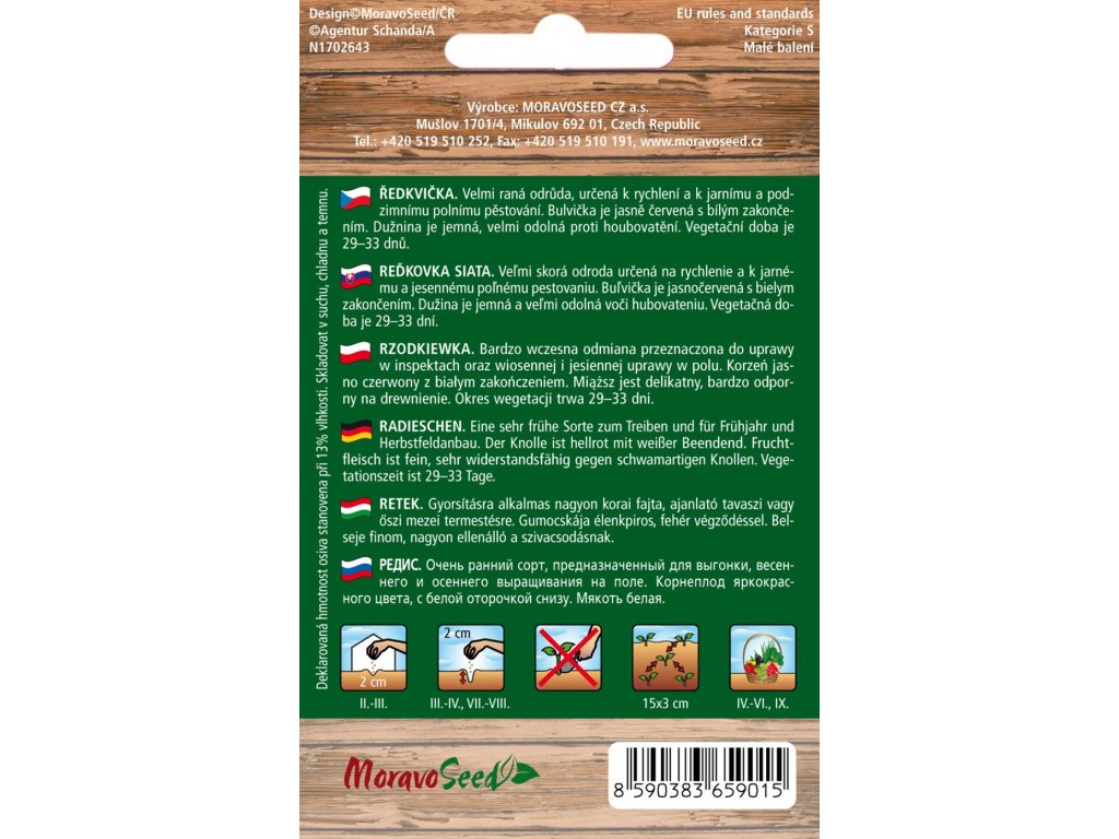 Raná odrůda určená ke studenému rychlení a ranému polnímu pěstování. Bulvička je dlouze válcovitého tvaru, červená, na spodní části je bílá. Vegetační doba od výsevu je 32-35 dnů.