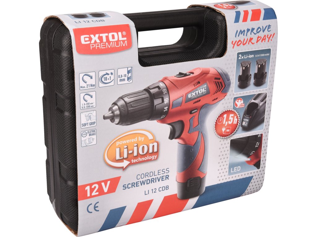 Šroubovák aku vrtací, 12V Li-ion, 1300mAh, Extol Premium