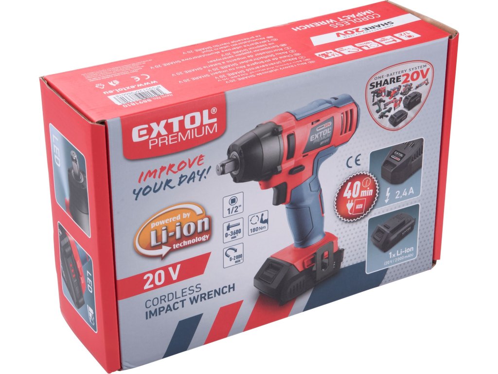 Lehký a výkonný rázový aku utahovák s max. kroutícím momentem 180Nm Vám poskytuje výkon, který potřebujete k dokončení široké škály utahovacích operací – utahování a povolování šroubů. Rázový moment zvyšuje sílu utahováku při šroubování a zároveň snižuje spotřebu baterie. Proto je při šroubování mnohem efektivnější než aku vrtačka a také zašroubuje více šroubů na jedno nabití baterie. Celokovová převodovka zajišťuje bezchybný chod při i vysoké zátěži a přispívá k lepšímu odvodu tepla vznikajícího při práci. Pro běžnou práci dostačují jeden nebo dva 2000mAh akumulátory, které můžete rychle nabít v rychlonabíječce, pro náročnější nebo delší práci doporučujeme větší akumulátory s kapacitou 4000–8000mAh. Akumulátor lze použít ve všech typech nářadí řady EXTOL SHARE20V. Díky použité Li-ion technologii je ho možné kdykoliv dobíjet, aniž by se tím snižovala jeho kapacita. Li-ion akumulátor ztrácí energii vlivem samovybíjení velmi pomalu a vydrží dlouho nabitý a připravený k použití.