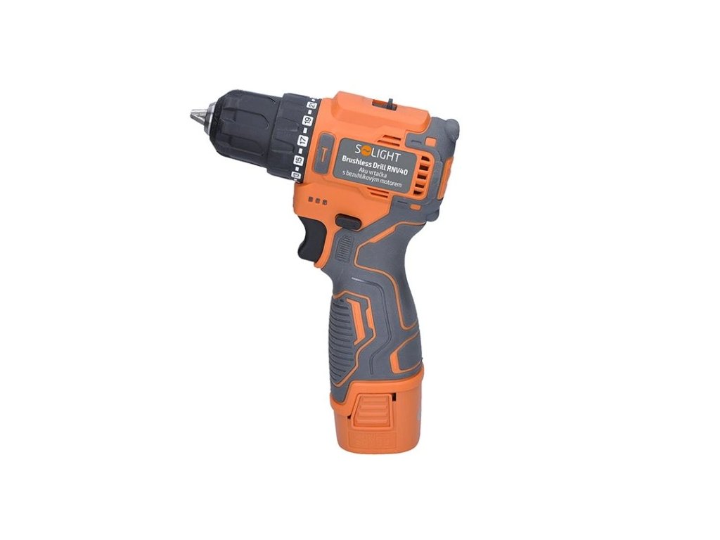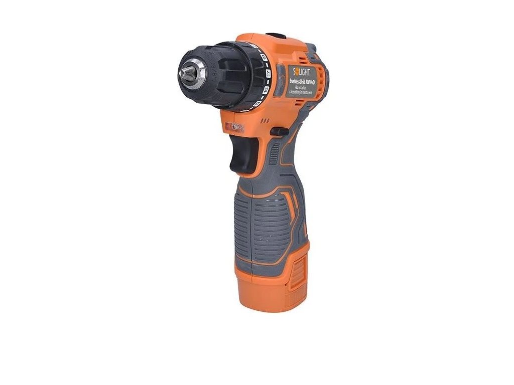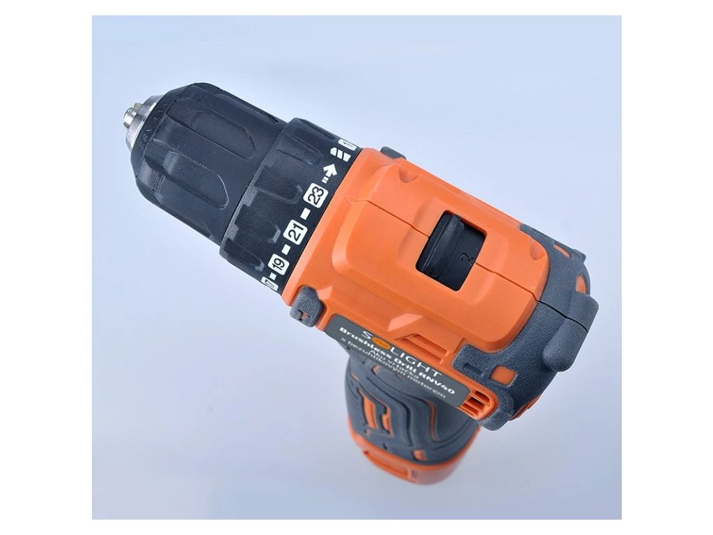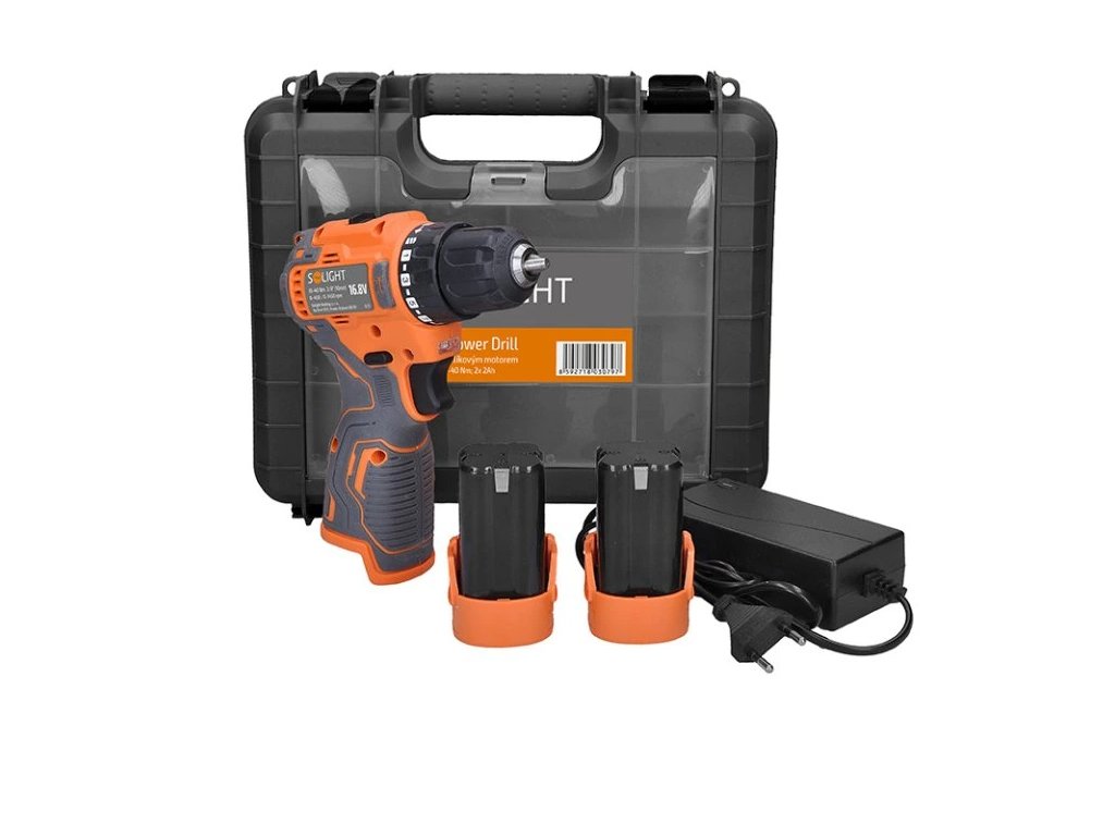 Solight aku vrtačka s bezuhlíkovým motoreM, krouticí moment 40 N.m, nastavení 20+1 úrovní krouticího momentu , průměr sklíčidla 10mm, regulace rychlosti otáček spouští, 2ks Li-Ion baterií 16,8V 2Ah, otáčky: 0-450/0-1450 ot.min, přisvícení LED, váha produktu bez baterií: 0,75kg